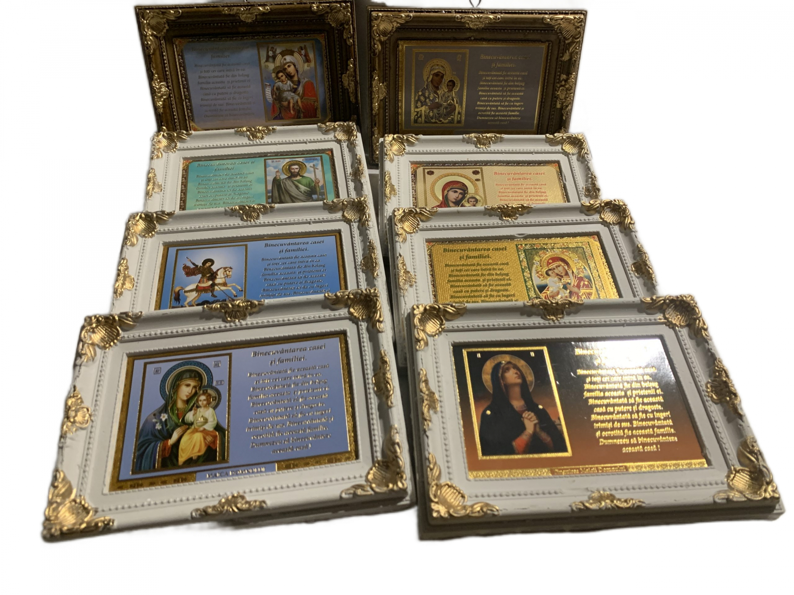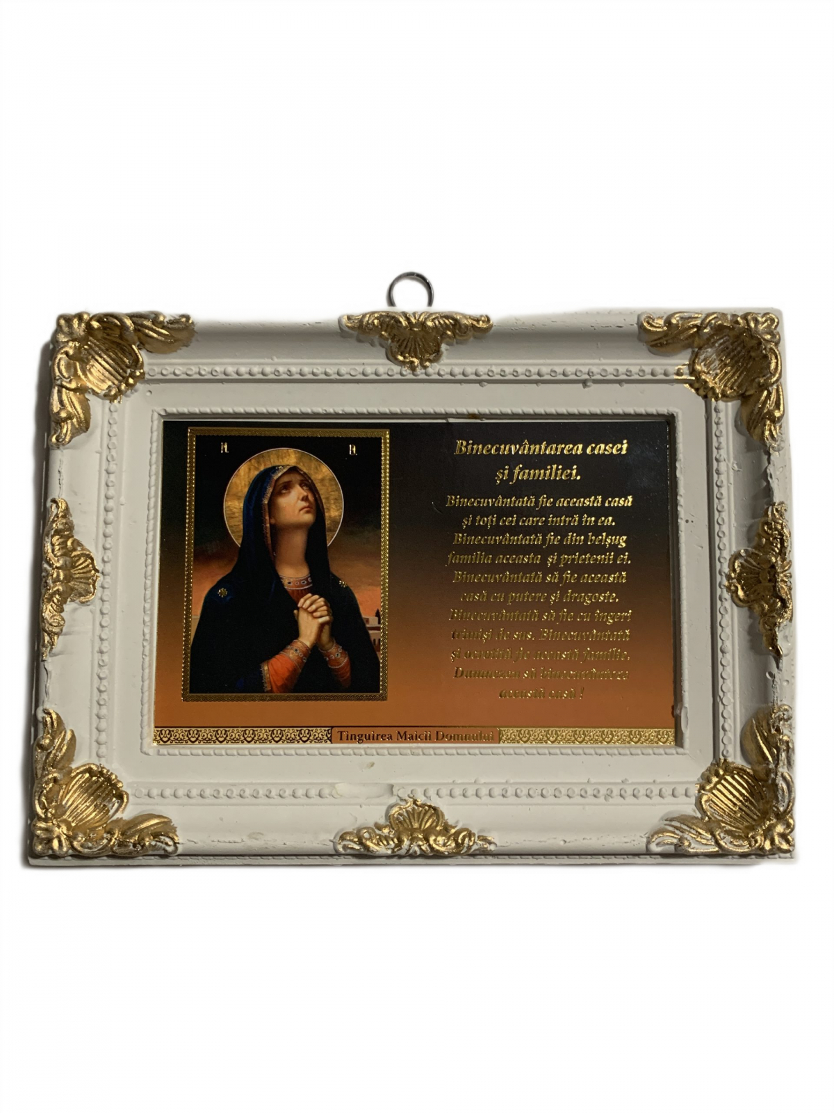 Icoană litografie aplicată pe ramă de ipsos, cu agățătoare pentru perete.